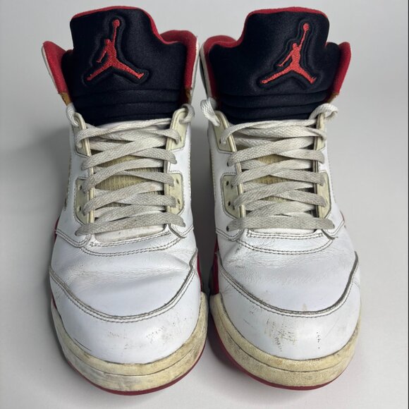 Nike Air Jordan 5 Retro “Fire Red” 2013 Black White Tongue Sneakers, size most likely 10 or 10.5 in men's sneakers. They have some regular wear throughout, please refer to the images. Very comfortable and stylish sneakers.