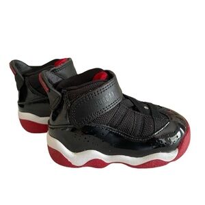 These adorable Air Jordan’s are black, varsity red and white and feature a patent leather and mesh upper. They look brand new and are perfect to add a bit of swag to your little one’s look.