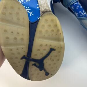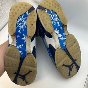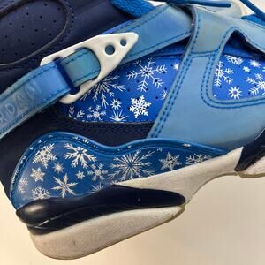Step into winter style with these rare Nike Air Jordan 8 Retro GS “Snowflake” sneakers in youth size 4.5Y. Featuring an eye-catching blue and white snowflake print with classic AJ8 silhouette detailing, these kicks are a collector's must-have. The mid-top design includes adjustable cross-straps and a padded collar for secure and comfortable wear. Signs of wear are present including scuffs and sole wear, but overall structure is intact (see all photos).