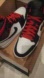 Stylish Nike athletic shoes. Bold black and white design. Striking red accents and laces. Perfect for sports and casual wear.