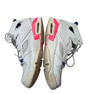 Colorway: This specific "Ultramarine" colorway features white tumbled leather on the upper, with accents of "Ultramarine" blue on the lace eyelet, heel pull tab, tongue, and ankle lining, and "Solar Red" (a shade of pink/red) on the Jumpman branding and midsole.
