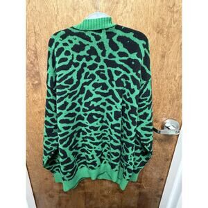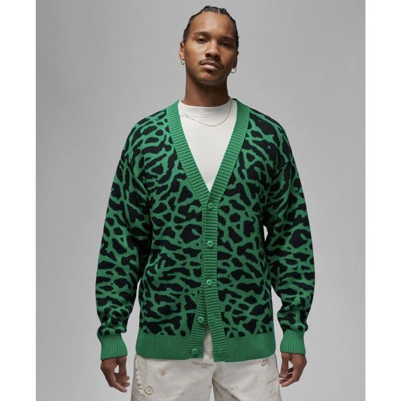 The Nike Air Jordan Heritage Cardigan Sweater in size L is a stylish and cozy outerwear piece perfect for men. Featuring a loose fit design, this green sweater with animal print pattern showcases the iconic Jordan brand. Made with quality materials, this cardigan is a versatile addition to any wardrobe, offering both comfort and style for everyday wear. Perfect for those looking for a unique and trendy sweater that makes a statement.