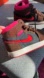 Nike Air Jordan high-tops featuring a striking red swoosh. Brown suede overlays with black base. Pink collar adds a vibrant touch.