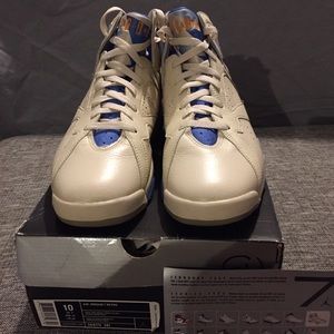 Limited release Nike Air Jordan 7. Cream tumbled leather with blue and orange accents. Some minor aging on the bottoms however I do not believe these were ever worn.