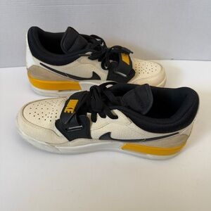 Nike Air Jordan legacy sneakers, lace up, strap closure, a cream and black design with a touch of yellow. Perfect for everyday wear. Excellent preowned condition gently used, some marks,scratches with minor signs of wear, dirt on the sole. Size: 8.5 CD 7069-200 Leather/Suede Ship same/next day Tags: spring, summer, all seasons, athletic,casual, sports, unisex Nike Jordan sneakers, Nike air sneakers, Jordan legacy sneakers
