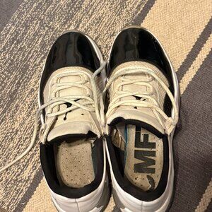 The Nike Air Jordan Low Men's Size 9.5 DV2207-100 is a stylish and sleek sneaker from the iconic Air Jordan line. Featuring a low top design, patent leather upper material, and a color scheme of white, black, and dark Concord, this shoe is a perfect combination of fashion and function. With the renowned brand name of Jordan and a classic sneaker style, this athletic shoe is a must-have for any sneaker enthusiast looking to elevate their footwear collection. The shoes are in good shape! Only worn on indoor basketball court!