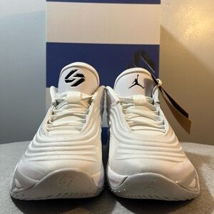 Sleek Jordan sneakers in white and gray. Modern design with iconic logo. Comfortable and stylish.