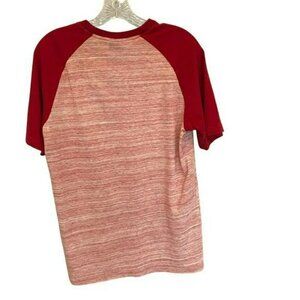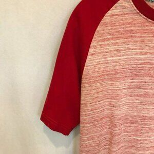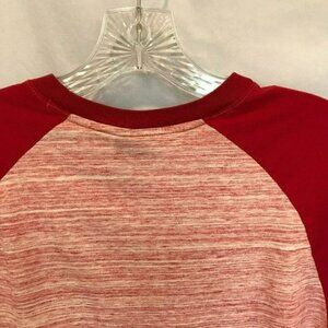 Color red heather with solid red sleeves. Size Medium.