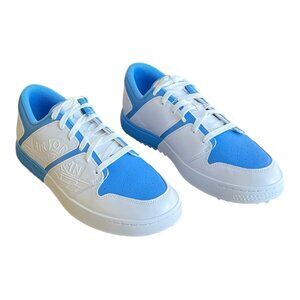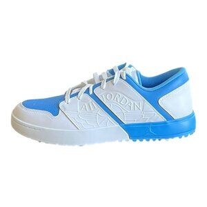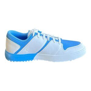 The Nike Air Jordan NU Retro 1 Low G Golf UNC White-Univ Blue Shoes in size 9 and 11 are a stylish and comfortable option for avid golfers. Featuring a low top silhouette with a colorblock pattern, lace-up closure, and standard shoe width, these shoes offer a retro look with modern performance features. Made with synthetic lining and leather upper material, these athletic shoes from the Air Jordan product line are perfect for casual and activewear occasions, showcasing a theme of University, Retro, and Sports. With cushioned and comfortable design, these shoes are ideal for golf enthusiasts looking for a blend of style and functionality on the course.