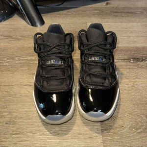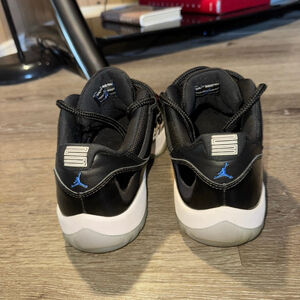 This pair of 100% Authentic Nike Air Jordan Retro 11 Low Space Jam 11s , size US 8.5, features a black mesh upper with a glossy black patent leather mudguard, a white midsole, and a translucent icy blue outsole. Blue Jumpman logos are visible on the tongue and heel. These shoes are in great condition unfortunately do not have original box but will be shipped with care