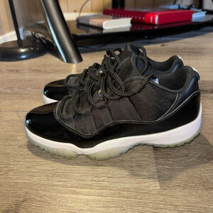 This pair of 100% Authentic Nike Air Jordan Retro 11 Low Space Jam 11s , size US 8.5, features a black mesh upper with a glossy black patent leather mudguard, a white midsole, and a translucent icy blue outsole. Blue Jumpman logos are visible on the tongue and heel. These shoes are in great condition unfortunately do not have original box but will be shipped with care