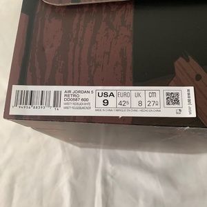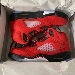 Nike Air Jordan retro 5 varsity red/black. Originally released in 2009 as part of the two-shoe Raging Bulls pack, the Air Jordan 5 Retro 'Raging Bull' 2021 brings back one of those colorways with this April 2021 release. The shoe's suede upper appears entirely in Varsity Red, contrasted by black eyelets and highlighted by a reflective silver tongue. Mesh inserts maintain the classic Jordan aesthetic, with a toggle lacing system securing the fit. Underfoot, the polyurethane midsole includes visible Air in the heel for cushioning, highlighted by the white and red shark-tooth detailing on the forefoot. Men's size 9.