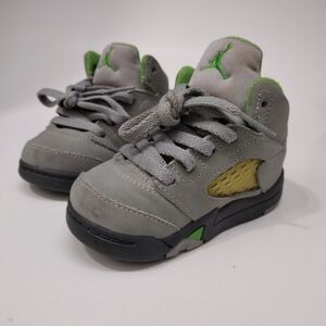 Selling a pre-owned pair of Jordan Retro 5 "Green Beans" sneakers in TD size 5C. Shoes are in good condition with minimal wear, 1 shoe has a scuff on the toe box (pictured) but not too noticeable on feet. Super Rare and HTF pair in this size from 2006. Box is a bit damaged but it is still intact. Great for the Jordan collector. Cleaning out my kiddos closet and they've outgrown a bunch of sneakers so looking to pass them on to someone else.