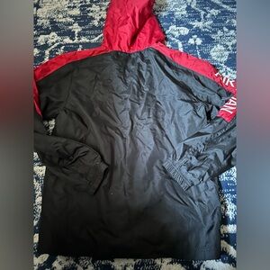 Nike Air Jordan windbreaker jacket in black and red. Features a hood, quarter zip, and logo detailing. Great condition.