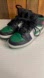 Jordan 1 Mid Green Toe (GS) features a white, black, and green leather upper with red Air Jordan Wings logos on the collar. From there, a matching sole and Jumpman woven tongue label adds the finishing touch.