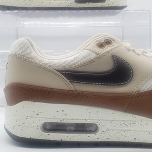 Selling these Nike Air Max 1 sneakers in a cream and brown colorway with black details. In excellent condition, featuring a speckled sole and premium materials. Perfect for any outfit and super comfortable for daily wear.