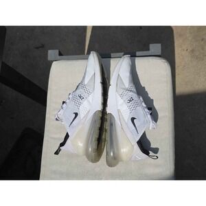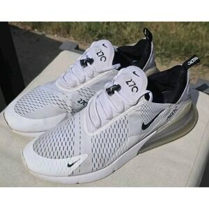 Step into comfort and iconic style with these Nike Air Max 270 shoes in a versatile white and black colorway (AH8050-100). This sought-after silhouette combines heritage Air Max design elements with modern innovation, offering a distinctive look and feel. The eye-catching large Air unit in the heel provides excellent cushioning and a responsive ride, making these sneakers suitable for various activities, from daily wear to light athletic pursuits. Crafted with a breathable mesh upper, these Air Max 270s ensure ventilation and a lightweight feel, keeping your feet comfortable throughout the day. The bootie construction offers a snug, adaptive fit that moves with you. The clean white and black aesthetic makes these shoes easy to pair with a wide range of outfits, adding a touch of sporty sophistication to your wardrobe. These Nike Air Max 270 shoes are in good pre-owned condition. They have been cared for and show signs of wear consistent with their condition, maintaining their structural integrity and much of their visual appeal. This is a great opportunity to own a classic and comfortable pair of Nike sneakers.