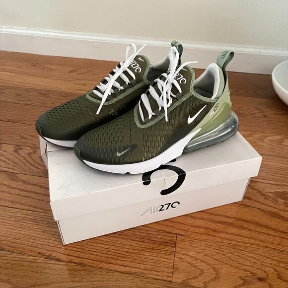 Nike Air Max 270s in a sleek olive and white colorway with that signature cushioned heel. Sporty, comfy, and easy to style for everyday wear or athleisure looks.