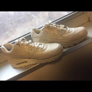 All white nike air max 90s. They have only been worn twice. They go good with various outfits. Size 7 men's and 9 woman's.