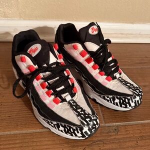 Step up your sneaker game with these rare Nike Air Max 95 "Just Do It" edition kicks! Featuring a bold black, white, and infrared colorway with graphic text details, these sneakers bring classic Air Max comfort with a streetwear edge. The iconic Air cushioning ensures all-day comfort, while the durable rubber outsole makes them perfect for everyday wear.