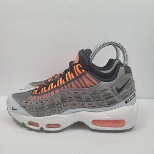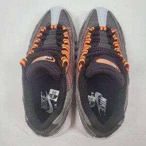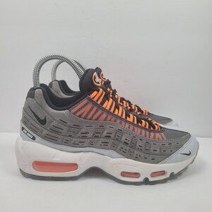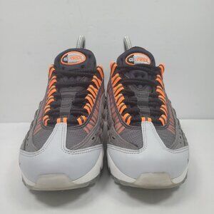These Nike Air Max 95 sneakers combine style and comfort, featuring a striking design with grey and orange accents. They offer a cushioned sole for support during athletic activities or casual outings.