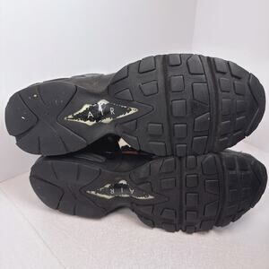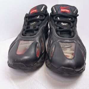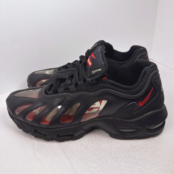 The Supreme x Nike Air Max 96 "Black" is a highly sought-after 2021 collaboration that reintroduces the classic Air Max 96 silhouette with a bold, contemporary update. The black leather upper is defined by translucent, shark-tooth cutouts that reveal the sock, replacing the original mesh paneling and adding a distinctive, modern edge. It features classic Max Air cushioning units in the sole for all-day comfort, and reflective 3M piping runs around the shoe for visibility. Supreme branding subtly appears on the heel and insole, making this a collector's item blending streetwear heritage with running shoe tech. Style Code: CV7652-002