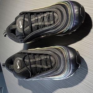 Nike Air Max 97 Black Leather&Mesh With Yellow/Green/Purple/Red Stitch Women's 11. Gently Used, Excellent Condition With Minimal Wear. The Foam Composite Is Clear Coated With Glitter. The Soles Show Minimal Wear.