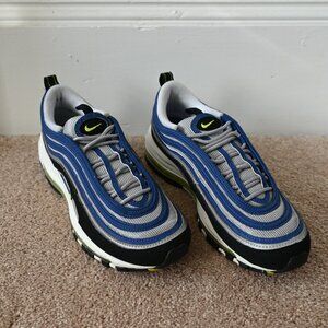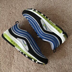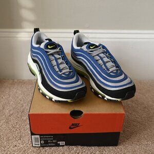 Nice, gently used pair of Nike Air Max 97 OG t sneakers in “Atlantic Blue Heather/Metallic Silver/Black/Voltage Yellow” colorway. Inside size tag states men’s 8.0, equivalent to women’s 9.5. Includes the original box.