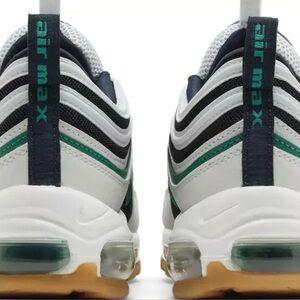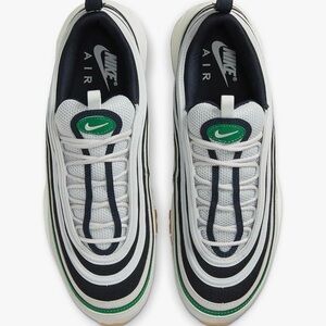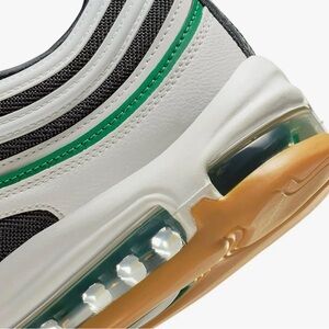Sleek Nike Air Max 97 with white, green, and black accents. Features gum soles and signature air cushioning.