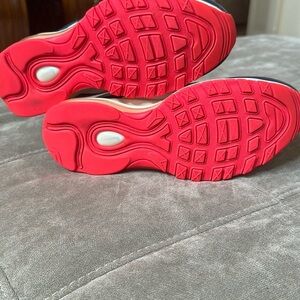 Stylish Nike Air Max 97 with a sleek design. Features a white upper with navy accents. Vibrant pink sole adds a pop of color. Iconic Air Max cushioning for comfort.