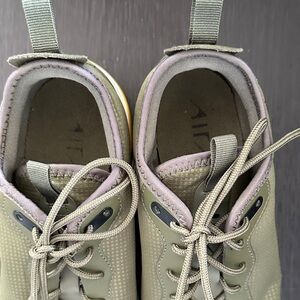 Stylish olive green sneakers featuring a yellow accent. Perfect for casual wear.