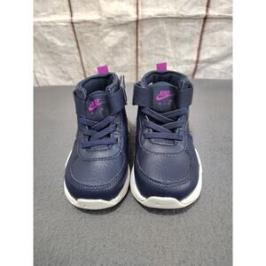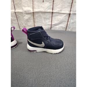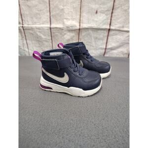 Elevate your child's footwear game with the Nike Air Max Goaterra 2.0 Preschool Midnight Navy Metallic Silver Size 5C sneakers. These high-top boots are perfect for any occasion, whether it's for travel, activewear, or casual wear. The round toe and hook & loop closure provide comfort and convenience for your child's tiny feet.