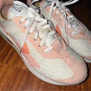 Brand new, never been worn. Women’s size 8, fits true to size. Light Pink/Beige/Coral colorway with gum bottoms. Mixture of leather, canvas and textured pattern. Design on outer part of shoe on the heels, refer to pictures. DOES NOT COME WITH ORIGINAL BOX, but will box for shipping.