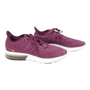 - The Nike Air Max Sequent 3 GS in Bordeaux/Metallic Gold is a running shoe designed for big kids. It features a burgundy mesh upper with metallic gold accents, including the Nike swoosh logo. The shoe also has a white midsole with a visible Air Max unit in the heel for cushioning. The outsole is made of rubber for traction.
