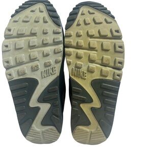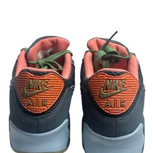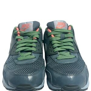 Nike Air Max sneakers with a dark gray body and coral accents. Features green laces for a pop of color. Ideal for everyday wear.