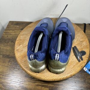 Features metallic blue and silver Foamposite uppers with mesh, unique futuristic molded design, and Air Max visible cushioning units at the heel for comfort. Original Nike and Air Max logo details on tongue and pull tab. Removable customizable lateral straps; one strap/clip broken (see photos, included).