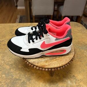 Stylish Nike Air Max sneakers. Features a vibrant pink swoosh. Comfortable and trendy design. Size 6. Excellent used condition