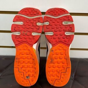 These running shoes are in great condition, their soles are white and there is no rips or tears on the upper. upper needs light cleaning to make the shoe look even better. The bottoms of the shoes have a bit of wear, but they aren’t bald there is definitely a lot life left on the thread of the shoe.