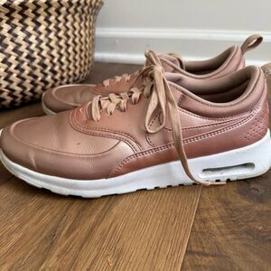 Nike Air Max Thea sneakers in metallic rose gold, which they call metallic red bronze. But to me, it’s definitely a shade of rose gold and pink not red. Very gently preowned. Minor surface dirt on the white undersides of the sole (understandable) and one tiny mark on the toe box but otherwise fantastic condition. See photos. Insoles are not included. We wear custom insoles, and we are keeping those.