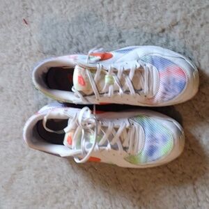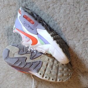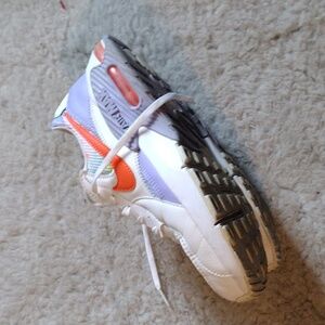 Stylish Nike Air Max with a sleek design. Features white, purple, and orange accents.