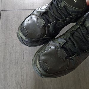 The Nike Air Monarch Mens Size 11 in Black offers comfort and style for walking and other athletic activities. Made with breathable leather uppers and cushioned footwear, these sneakers feature a lace-up closure and solid black colorway. Some creases as shown on toe bed area.