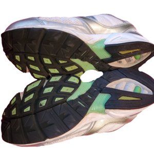 ✔️Features: Silver/White/Green, breathable mesh upper for cool comfort w/ supportive overlays that keep feet centered on the footbed, dual density midsole w/ a Visible Air Sole Unit for supreme cushioning, BRS 1000 in the heel for extra durability, modified traction-patterned outsole, signature logo accents, Size 8.🏃🏽♀️