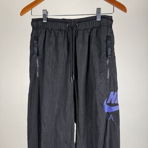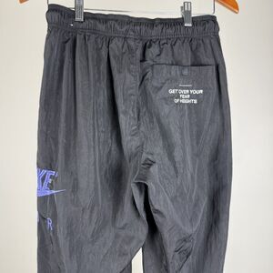 Nike Air black track pants featuring a purple embroidered Nike Air logo on the leg and white embroidered text on the back that reads “Get Over Your Fear of Heights.” Designed with an elastic waistband and drawstring, zippered front pockets, and elastic cuffs at the ankles. A versatile piece that works for casual wear, sports, or as a standout streetwear item.