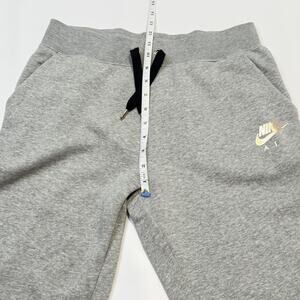 Bottom Features: Jogger sweatpants with elastic waistband and black drawcord with metal tips, side pockets, ribbed cuffs, Nike Air logo at left thigh, NIKE AIR print across back