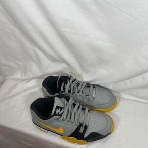 Nike Air Trainer SC High sneakers, gray with yellow and black accents. These iconic trainers are in excellent pre-owned condition with minimal wear. Featuring a durable leather and synthetic upper, these shoes offer both style and support, making them perfect for casual wear or light training. The striking colorway adds a vibrant touch to any outfit. Very clean with plenty of life left.