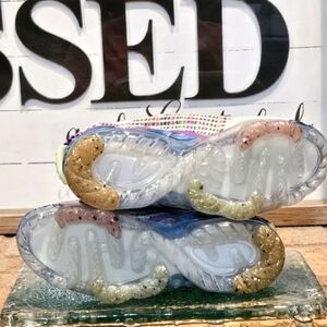 Upper is multicolored, featuring splashes of purple, red, pink, green, and blue in a checkered pattern interwoven with Pure Platinum.
