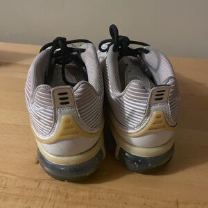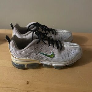 Nike VaporMax Plus in white with black laces. Features green accents on the logo. Sleek and modern design.