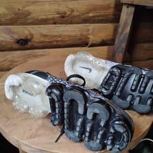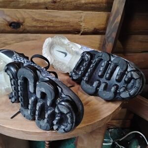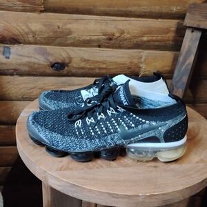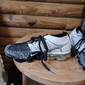 Stylish Nike Vapormax sneakers. Features a sleek black and white design. Perfect for casual wear.