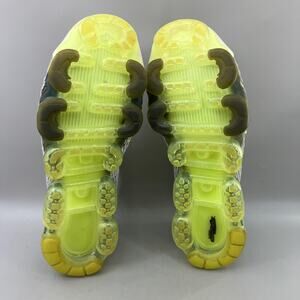 Pre-owned pair with moderate wear and discoloration on the outsoles, including yellowing of the VaporMax pods and a small dark scuff mark. Knit uppers are clean with light signs of use and no holes or tears; insoles show normal wear. Air units are intact and hold air properly; shoes come without original box or extra accessories.