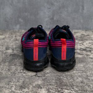 The Nike Air VaporMax Flyknit 3 in the Blackened Blue/Kinetic Green/Hyper Crimson colorway offers a vibrant, multi-toned look with a focus on lightweight comfort and responsive cushioning.